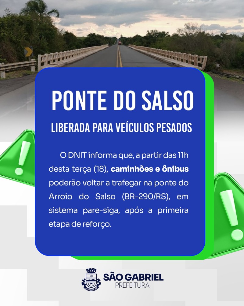 O Departamento Nacional de Infraestrutura de Transportes (DNIT) informa que o tráfego de veículos pesados — caminhões e ônibus — será restabelecido sobre a ponte do Arroio do Salso, no km 397,3 da BR-290, em Santa Margarida do Sul, a partir das 11h desta terça-feira (18).