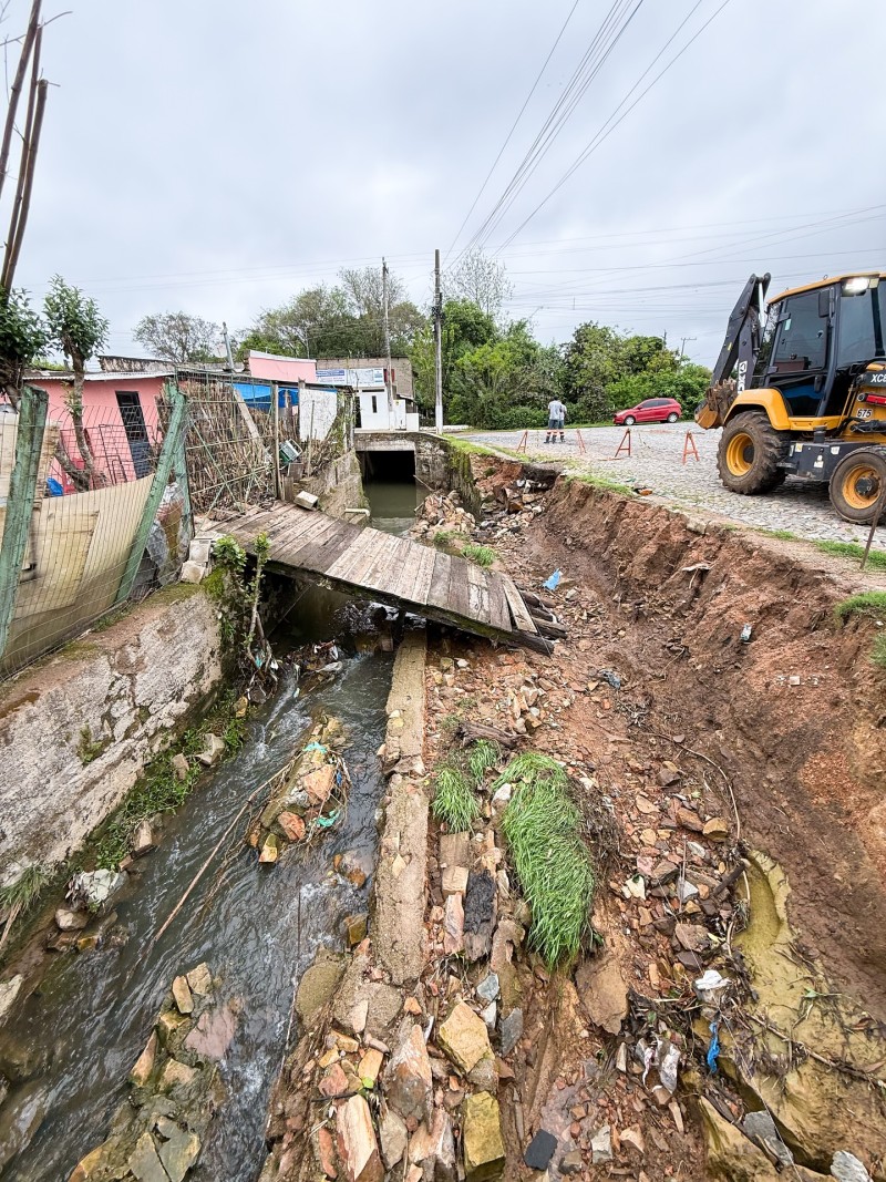 Além de reforçar a margem da sanga, o projeto prevê que a obra não comprometa o escoamento natural da água, permitindo o fluxo adequado e reduzindo o risco de novos danos causados pela erosão.